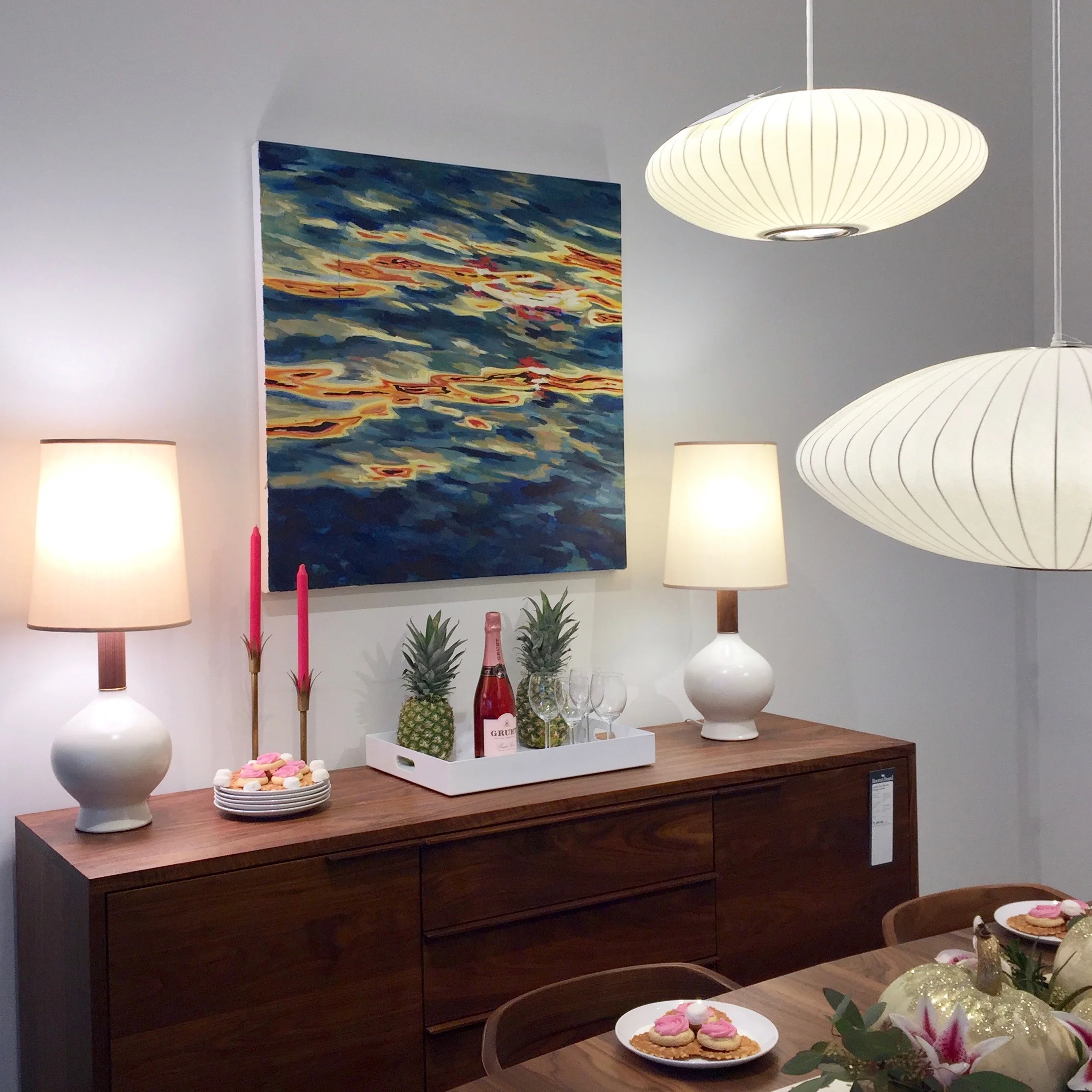 Seattle Magazine hosted an inspiring evening focused on holiday entertaining at the University Village Room & Board this past Thursday, October 27. A talented roster of local interior designers and bloggers each styled festive rooms in the store and shared their top entertaining tips for the season. I was thrilled to have my paintings featured in the beautiful space curated by Keri Petersen of KP Spaces with help from Alyse Hufford of Anthology House. Here are a few photos from their party-ready room: